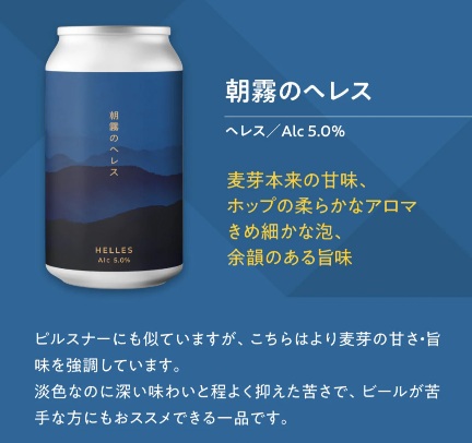 朝霧のへレス。ピルスナーにも似ていますが、こちらはより麦芽の甘さ・旨味を強調しています。淡色なのに深い味わいと程よく抑えた苦さで、ビールが苦手な方にもおススメできる一品です。